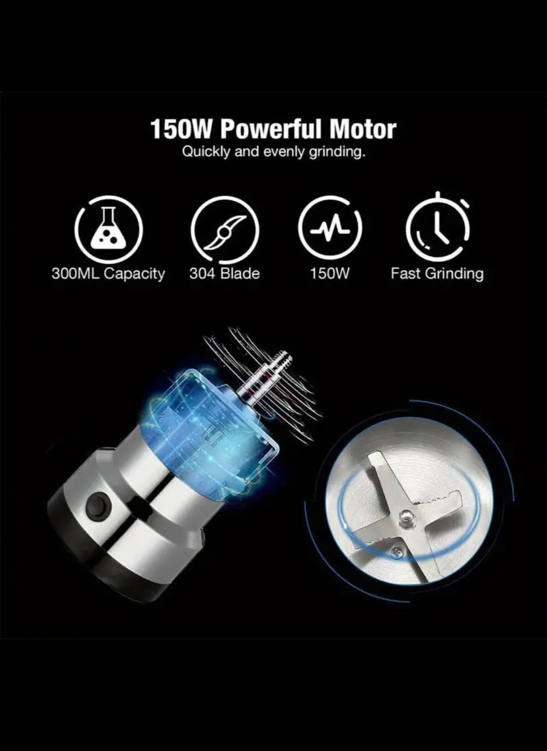 cereales, nueces, frijoles, molinillo de granosCaracterísticas:1. Cuchilla de acero inoxidable de dos hojas: la amoladora eléctrica adopta una cuchilla y un contenedor de 2 hojas de acero inoxidable de grado alimenticio, sin vibración y motor potente, que es muy adecuado para controlar los granos de café en unos segundos.2. Molienda multifuncional: Este pequeño molinillo doméstico multifuncional puede moler todo tipo de alimentos secos, incluyendo especias, frijoles, granos, pimienta, Chile, hierbas secas, nueces, granos de café, etc. ¡Perfecto para el uso diario!3. Fácil de usar: simplemente presione el botón de encendido/apagado para comenzar el trabajo de molienda y suelte el botón, la molienda se detendrá inmediatamente. Si no sabe cuánto tiempo debe usarlo. Simplemente observe sus partículas trituradas a través de la cubierta transparente.4. Suave y fácil de limpiar: los molinillos y molinillos de alimentos utilizan tecnología de pulido, suave y fácil de limpiar; no apto para alimentos húmedos, los recipientes y bases no se pueden lavar con agua.5. Fácil de llevar con una mano: El diseño compacto de este molinillo de café ocupa un pequeño espacio en el mostrador y es fácil de guardar en un armario o cajón. Tiene las ventajas de una apariencia hermosa, ligereza y movimiento libre.Descripción:Esta pequeña amoladora doméstica es fácil de operar, simplemente presione el botón de encendido/apagado para comenzar el trabajo de molienda. Suave y fácil de limpiar, fácil de llevar con una mano.Especificaciones:Material: acero inoxidable Categoría: Rectificadora pequeña doméstica Voltaje nominal: 220 (V)Potencia: 150KWVolumen: 300MLFuente de alimentación: enchufe Tamaño: 10,5*17cm