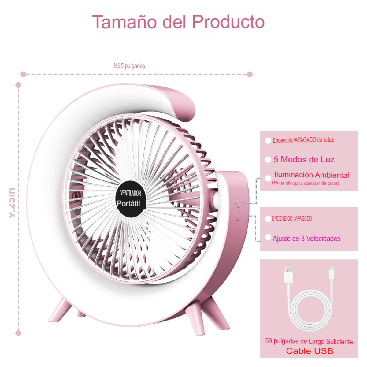 · Experimenta la frescura, la comodidad en cualquier momento y en cualquier lugar con nuestro Ventilador-Lampara RGB Forma C. Diseñado para brindar una experiencia de ventilación cómoda, este ventilador portátil se adapta perfectamente a diversas ocasiones, desde el hogar o la oficina.- Luz Ambiental Colorida: Nuestro ventilador no solo proporciona un flujo de aire refrescante, sino que también cuenta con una pequeña función de luz nocturna. Esta característica no solo ilumina su espacio suavemente, sino que también mejora la seguridad, eliminando la oscuridad de las noches.- Experiencia de Ventilación Cómoda: Con suministro de aire circulante de gran angular y una función de giro de cabeza de 180 grados, este ventilador asegura un flujo de aire suave, eliminando la sensación de congestión. Disfruta de una ventilación cómoda y personalizada.- Ajuste de Ángulo Múltiple: Diseñado con un ajuste de 180 °, puedes personalizar el ángulo del ventilador para satisfacer tus necesidades específicas. Adapta la dirección del flujo de aire según tu preferencia y entorno.- Uso a Largo Plazo: Las baterías de litio de gran capacidad ofrecen una experiencia de usuario duradera. Además, el diseño de carga TYPE-C incluido no solo facilita la recarga sino que también hace que el uso sea más eficiente y conveniente.- Ocasiones de Uso Amplio: Desde el hogar y la oficina hasta actividades al aire libre, este ventilador es tu compañero perfecto para mantenerte fresco en cualquier lugar. Con tres velocidades de viento ajustables, puedes adaptar la regulación del viento según tus necesidades específicas.